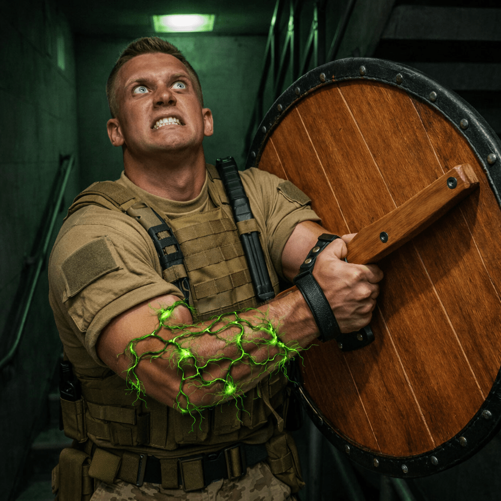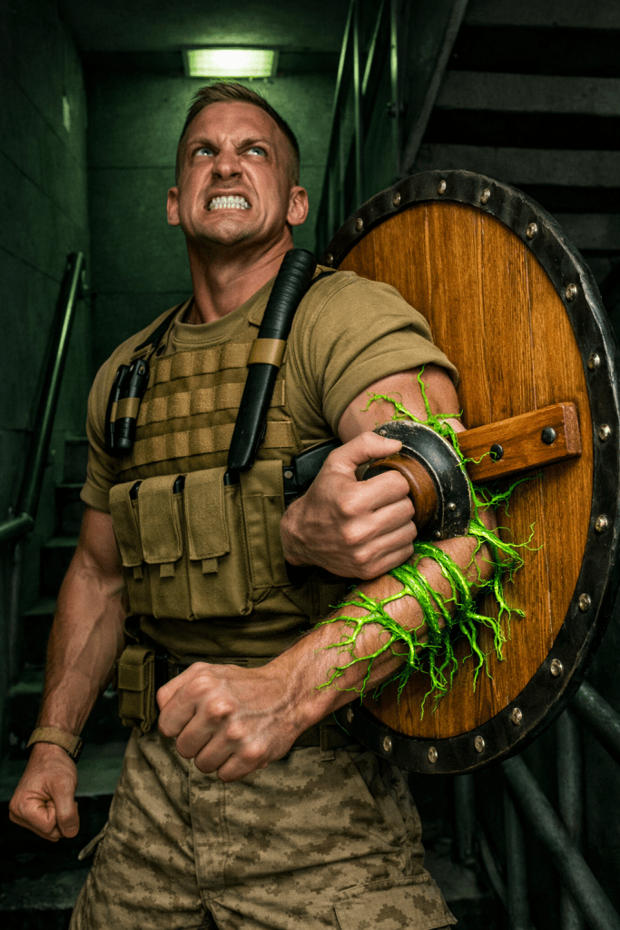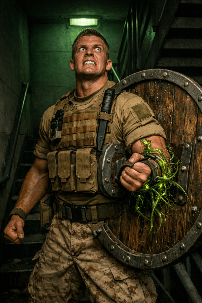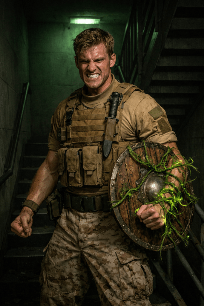 Me: Draw a man in the stairwell of a large building. There are no windows. The stairwell is lit only by emergency lights. The man is wearing US Military desert fatigues (year 2003 pattern) and desert boots. He has a green military utility belt with several pouches. He is wearing a tight-fitting tan top with a high neck and long sleeves, but the sleeves have been rolled up. His tight-fitting top has green tabs sewn into the wrists and shoulder-boards. He is wearing a desert tan military tactical vest with a Marine K-Bar attached. He is dirty blonde and muscular, but slim and tall. He is holding both arms down and away from his body, fists clenched. In his right hand is a wooden viking shield. The shield is covered with green living vines that are penetrating the skin on his forearms. The shock from the vines are causing him to clench his teeth and he appears to be getting a high dose of adrenaline from the shield vines.